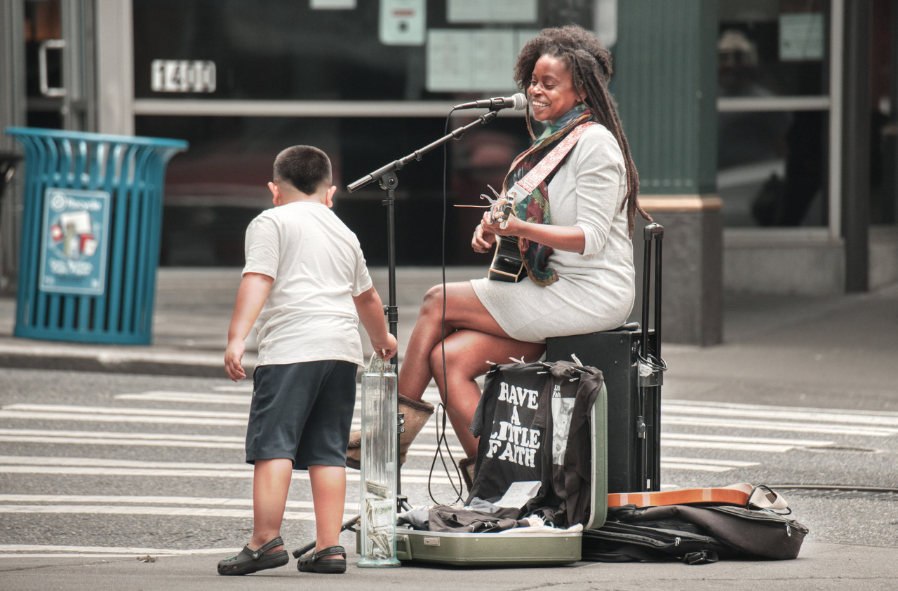 I love the way she looks to the boy, who is giving a tip, and she has a shirt saying “have a little faith”, I felt this was a very strong picture, again, brought to you by the 400mm lens, this was taken on a Saturday, close to the Seattle Public Market.